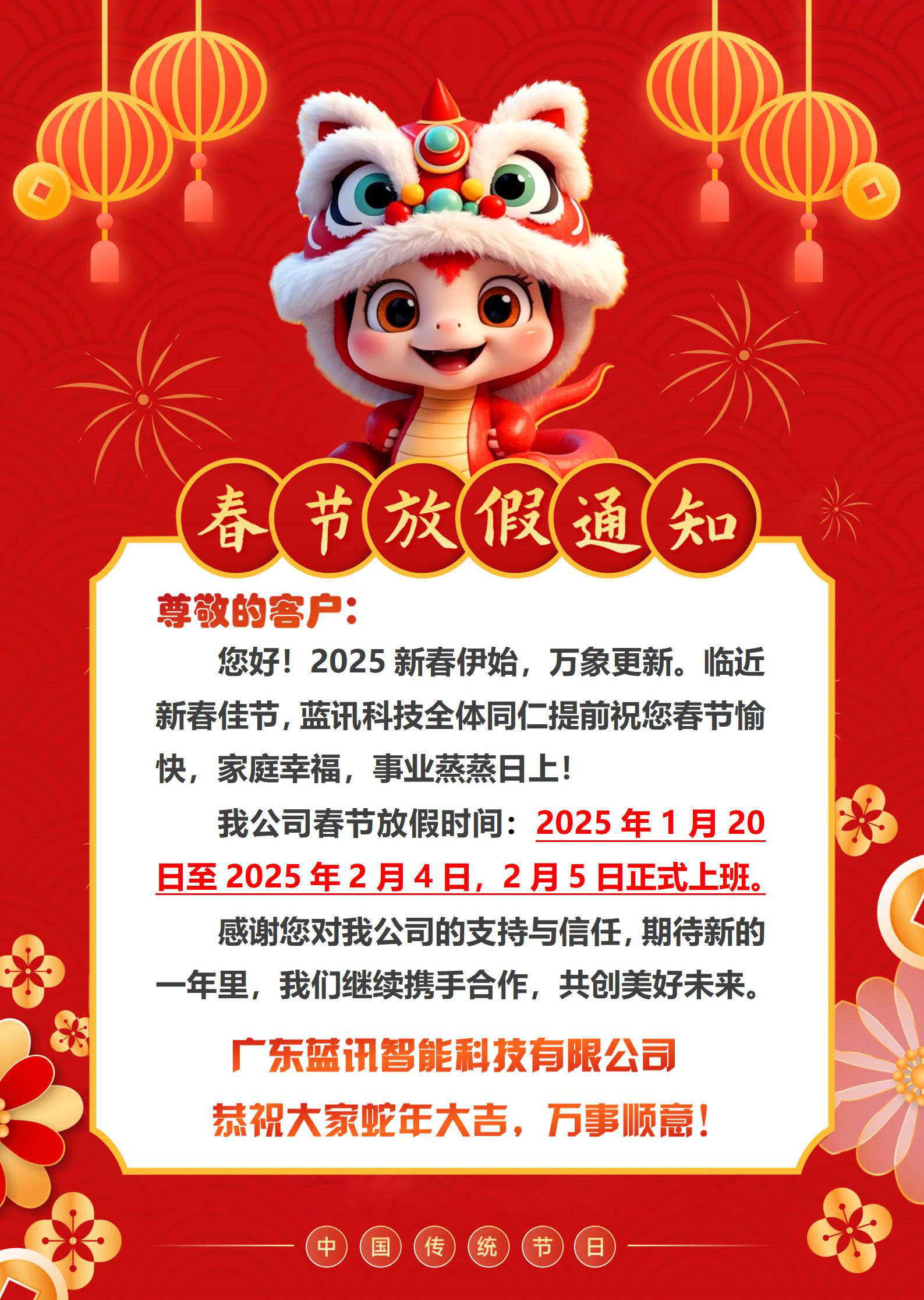 我公司春節(jié)放假時間:2025年1月20日至2025年2月4日,2月5日正式上班。感謝您對我公司的支持與信任,期待新的一年里,我們繼續(xù)攜手合作,共創(chuàng)美好未來。