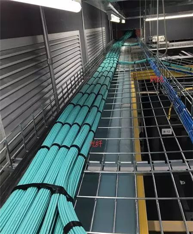 如圖所示,橋架內(nèi)光纖和網(wǎng)線分開整齊布放,每隔一段距離用扎帶捆綁,保持美觀。