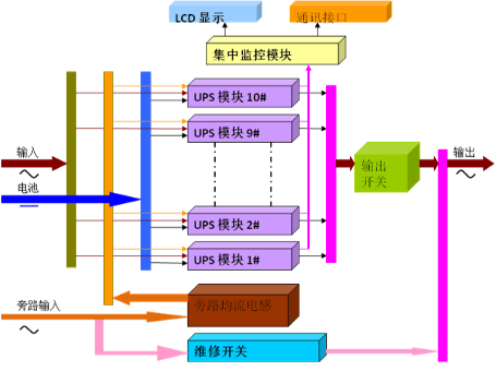 如圖所示:YMK系列UPS為模塊化設計,整機采用集中監(jiān)控,每個模塊間并機運行,且每個模塊集成旁路、整流、逆變單元。模塊間可以任意設置主用模塊數和備用模塊數,例如整機配置10個模塊,可配置為主用8個模塊,備用2個模塊。