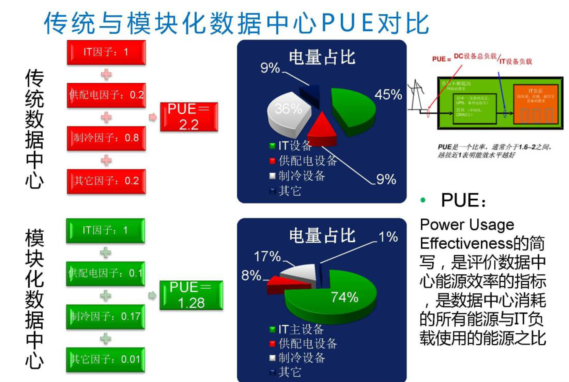 從上圖可以看出,傳統(tǒng)數據中心所采用的精密空調制冷,制冷部分耗電量占比很高,是數據中心能耗損耗的最大源頭。而采用模塊化機房后,制冷部分耗電量占比大幅降低,整體PUE可達1.5。