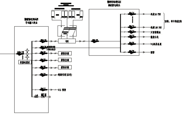 機房的動力設備如精密空調、新風換氣機由市電供電,其它計算機設備如服務器、交換機等由UPS進行供電。